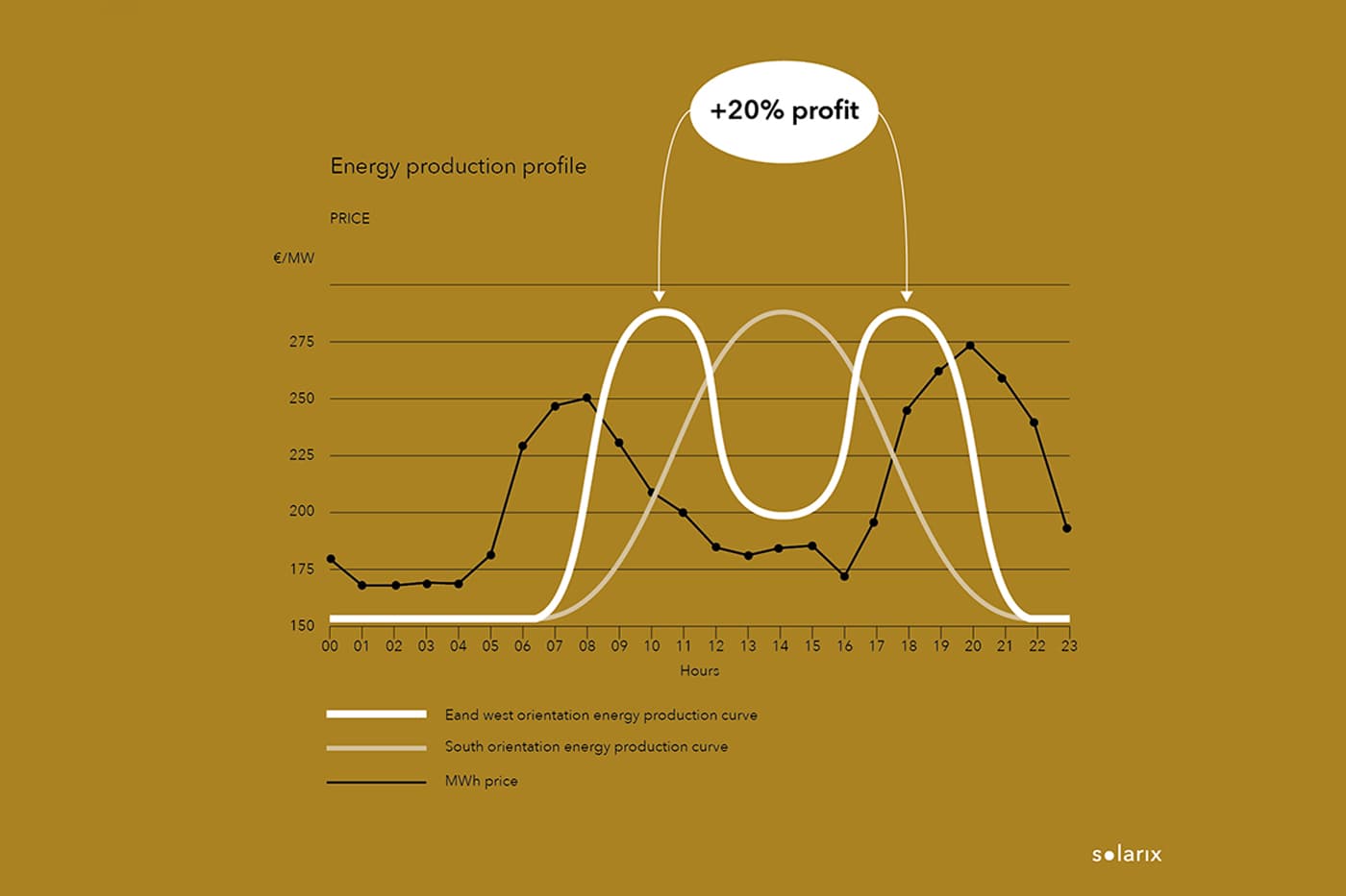 Favourable market prices: Vertical solar panels benefit from higher electricity prices during peak hours in the electricity market (EPEX spot). The production peaks in the morning and afternoon align better with these market prices.