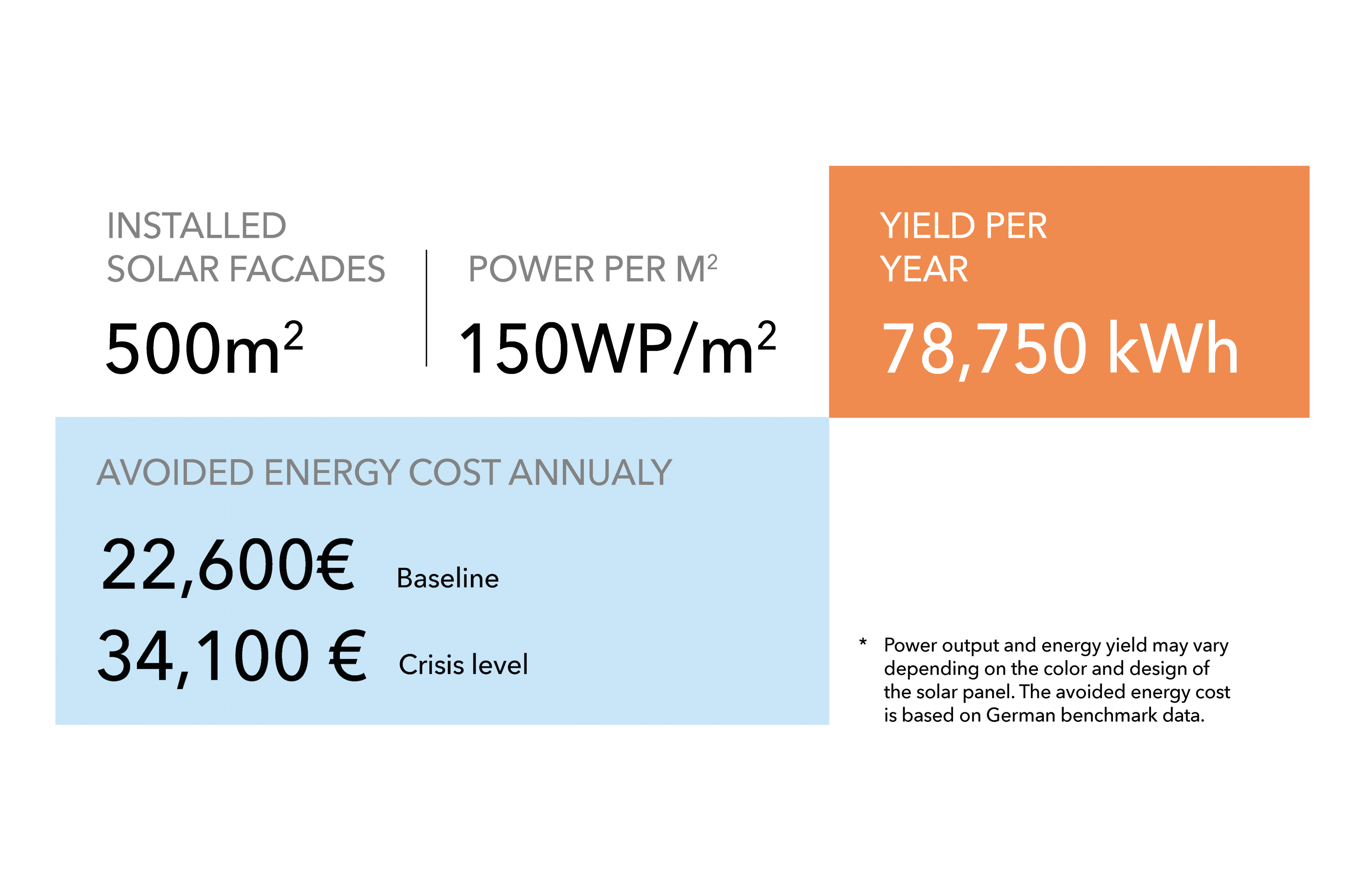 As a representative case, a coloured solar façade of 500 m² with a power density of 150 Wp/m² results in an installed capacity of approximately 75 kWp. Under German conditions, it can generate around 72,000 to 78,750 kWh per year. Based on the 2025 benchmark electricity price of €0.2875 per kWh, this translates into approximately €20,700 to €22,600 per year in avoided electricity costs when the energy is used on-site.