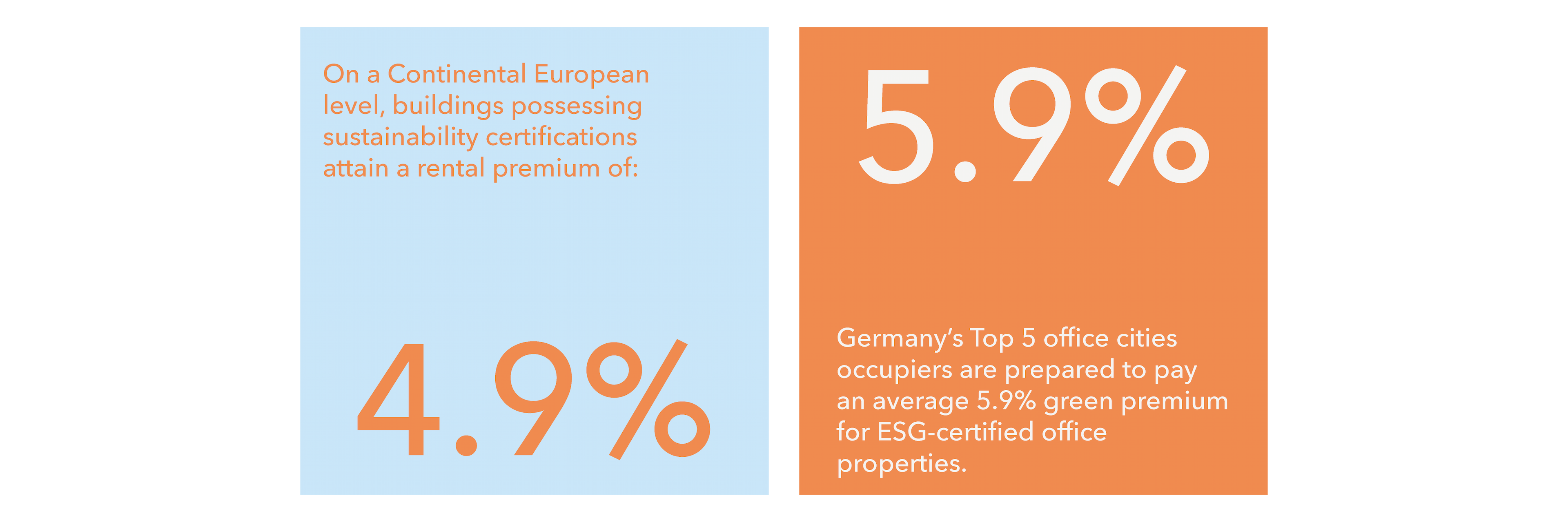 Occupiers prefer buildings with lower operating risks, strong sustainability performance, and predictable long-term costs. According to CBRE, sustainability-certified office buildings achieve an average rental premium of 4.9% across Continental Europe. In Germany’s top five office markets, tenants are willing to pay around 5.9% more for ESG-certified properties.