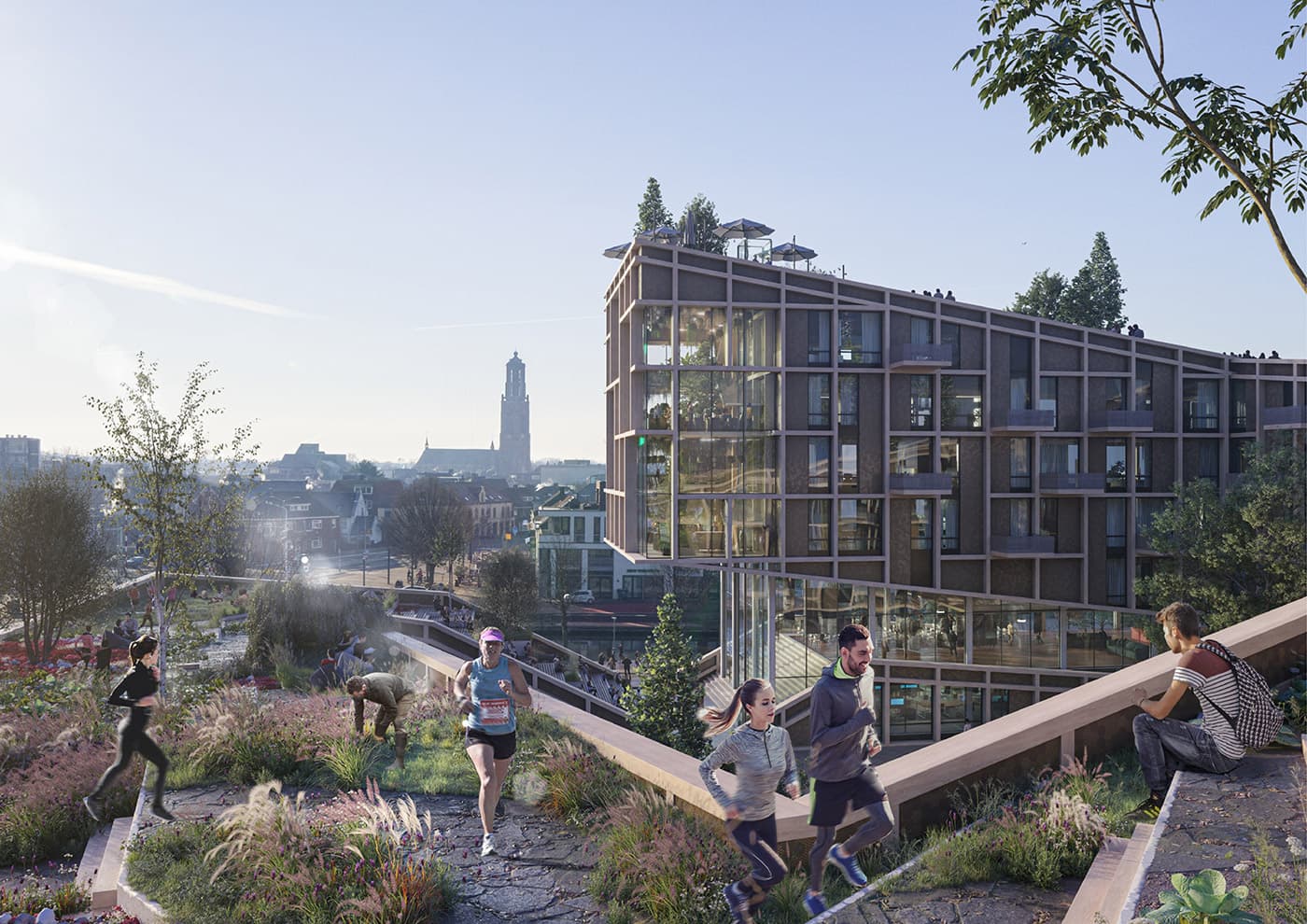 De bruin gekleurde Solarix zonnepanelen zijn als belangrijk onderdeel meegenomen in het totale gevelontwerp. Door een ander gevelmateriaal te vervangen door de energie opwekkende panelen van Solarix kan het dakoppervlak worden ingezet als publieke groenvoorziening.